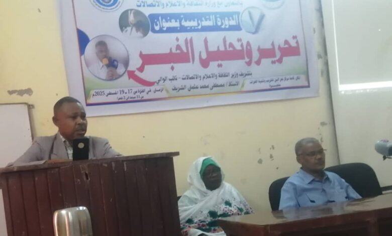 وجدد الشريف خلال مخاطبته اليوم بقاعة مركز نهر النيل للتدريب وتنمية القدرات بعطبرة الدورة التدريبية بعنوان تحرير وتحليل الخبر التى نظمتها الإدارة العامة للتدريب وتنمية الموارد البشرية بالتعاون مع وزارة الثقافة والإعلام لعدد 30 من منسوبي إدارات الإعلام لعدد 10 مؤسسات في 3محليات بالولاية والتى تستمر لمدة ثلاثة أيام في الفترة من 17الي19اغسطس الجاري ويشرف على التدريب الدكتور مزمل سليمان حمد الخبير الإعلامي.