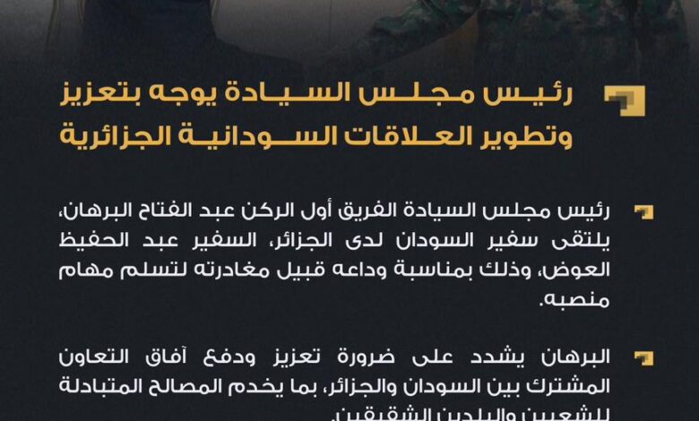 وجه السيد رئيس مجلس السيادة الانتقالي القائد العام للقوات المسلحة، الفريق أول الركن *عبد الفتاح البرهان*، بضرورة تعزيز ودفع آفاق التعاون المشترك بين السودان والجزائر، بما يخدم المصالح المتبادلة للشعبين والبلدين الشقيقين.