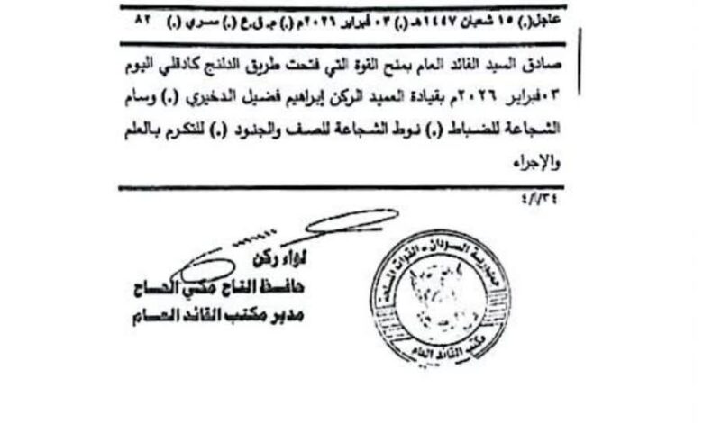صادق رئيس مجلس السيادة الانتقالي، القائد العام للقوات المسلحة، الفريق أول الركن عبد الفتاح البرهان، على منح وسام الشجاعة للضباط، ونوط الشجاعة لضباط الصف والجنود من القوات التي شاركت في عمليات تأمين وتطهير طريق الدلنج – كادقلي، ونجحت في فك الحصار المفروض على مدينة كادقلي بعد أكثر من عامين.